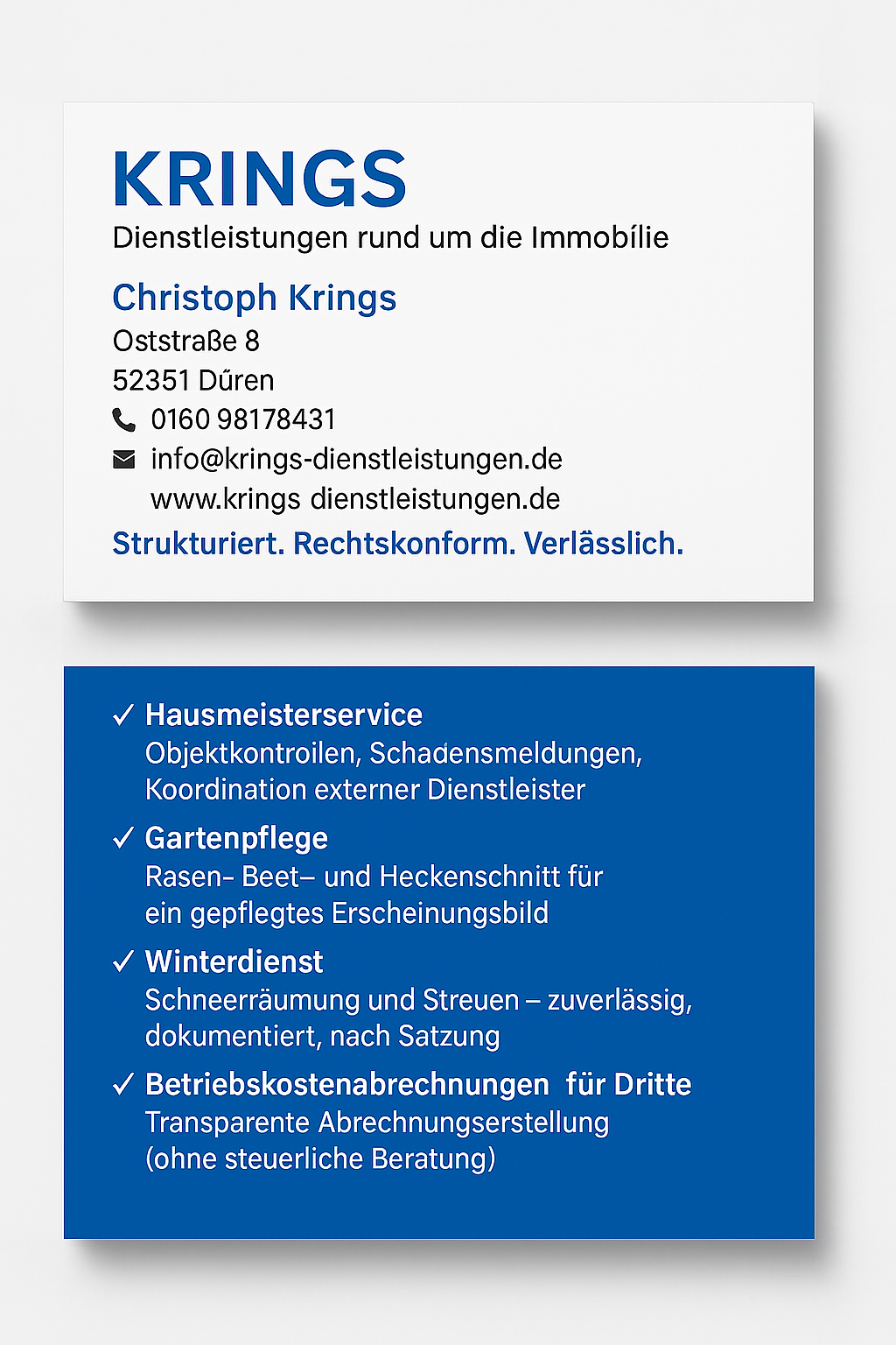 KRINGS – Dienstleistungen rund um die Immobilie ist kein Generalunternehmen und keine klassische Hausverwaltung. Wir bieten gezielte, rechtlich abgegrenzte Entlastung bei der täglichen Objektbetreuung: